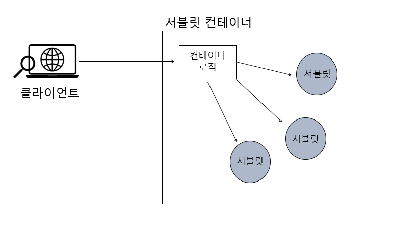 위 사진은 서블릿 기반의 애플리케이션을 웹에서 실행하기 위한 서블릿 컨테이너의 모습이다.